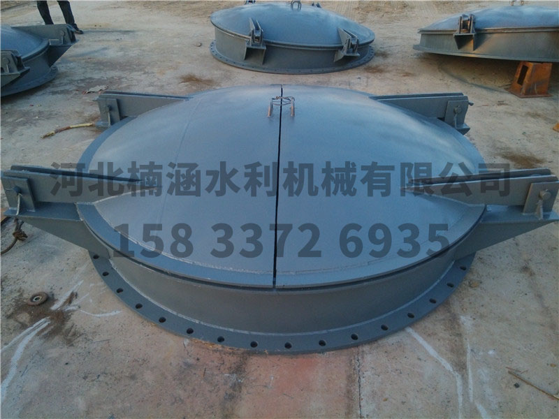 節能型側開式拍門由門板、門鉸、門座和密封件等組成。門板通過門鉸安裝在門座上,根據國內泵站的應用情況,拍門的門形圓形和矩形兩種。一般出水管口徑小于、等于2m的(即口徑1.6的泵)用圓形拍門,大于該口徑的用矩形拍門。