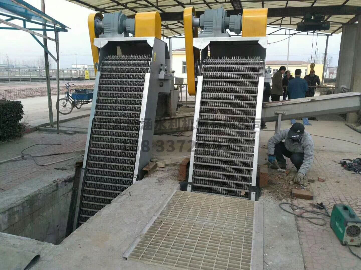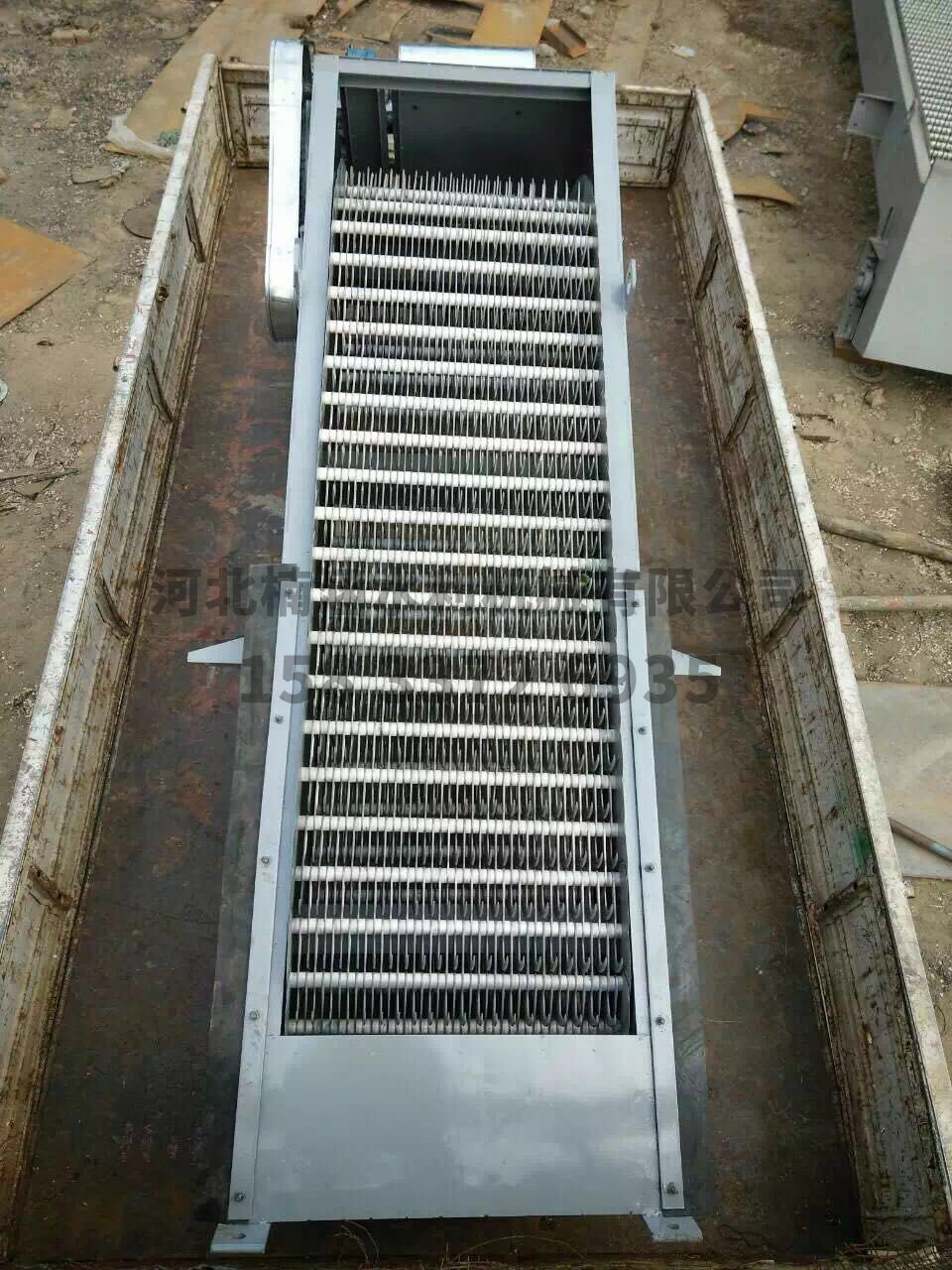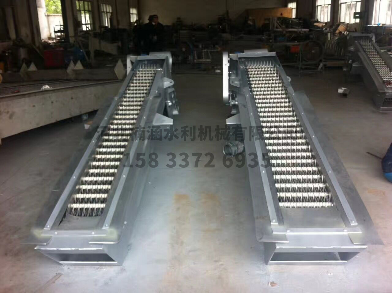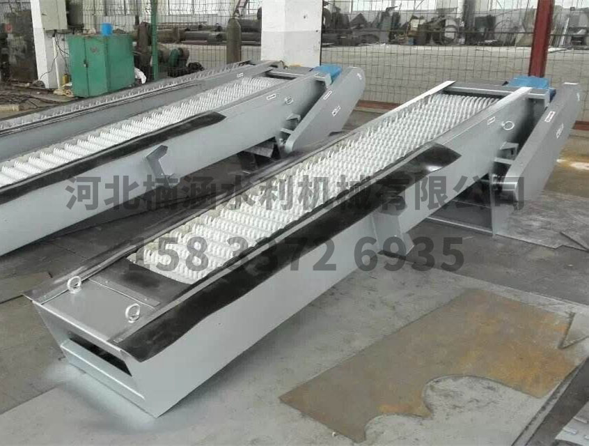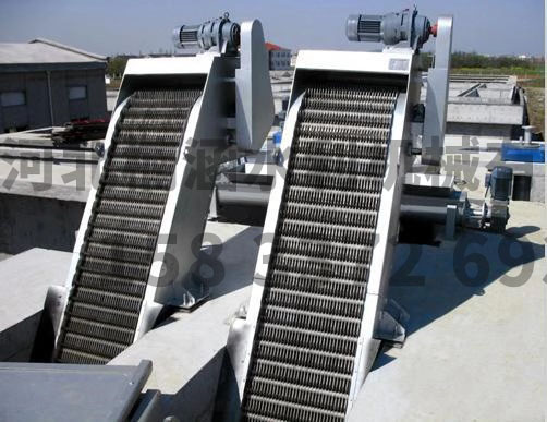 該機一般用作粗格柵使用,適用于各種市政、工業污水處理廠中用來去除污水中較大的懸浮物和飄浮物。柵條置于要架后部,若干個除污耙與物制的鏈條聯接在一起,在機架內作回轉運動,當除污耙經過柵時將柵條攔截的水中污物耙出并送至機了架上方,由卸渣裝置將其從排渣口排出。
